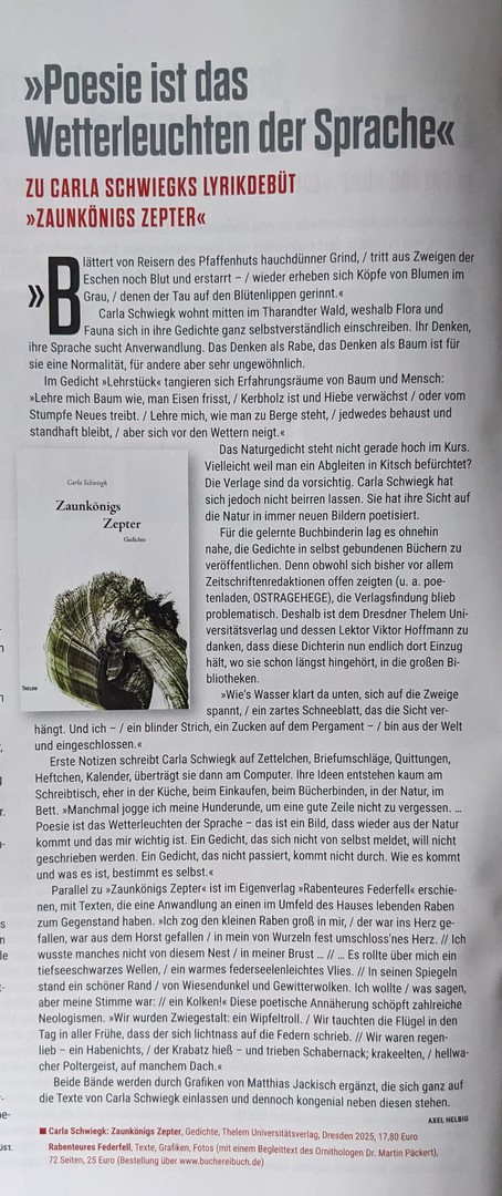 Carla Schwiegk: „Zaunkönigs Zepter“, Gedichte, Thelem Universitätsverlag, Dresden 2025, 72 Seiten, 17,80 Euro, ISBN: 978-3-95908-721-6. „Rabenteures Federfell“, Texte, Grafiken, Fotos (mit einem Begleittext des Ornithologen Dr. Martin Päckert), 72 Seiten, 20 Euro